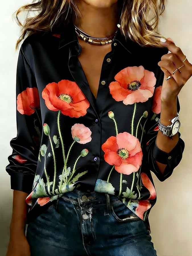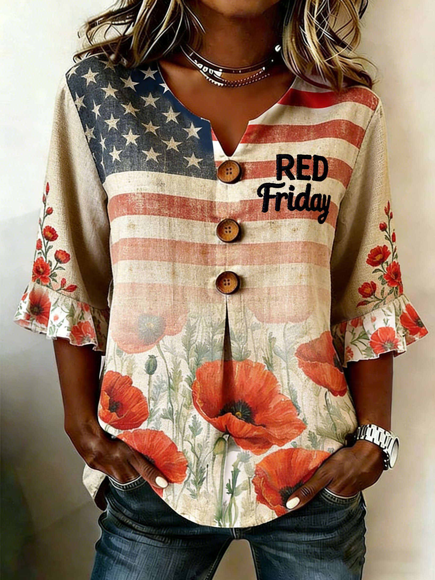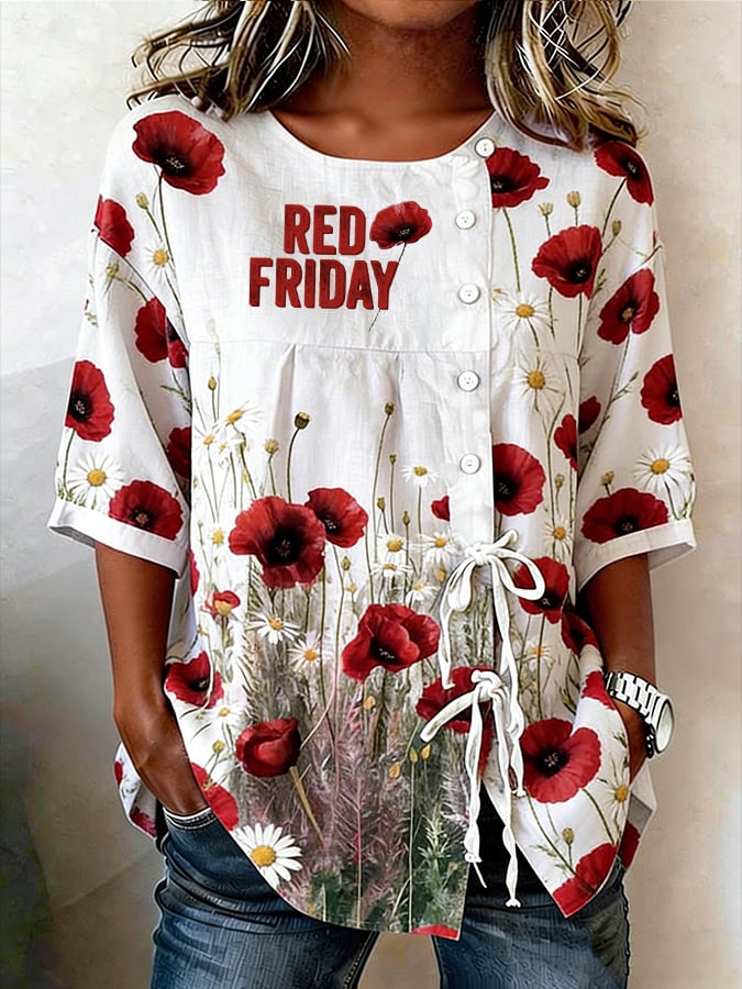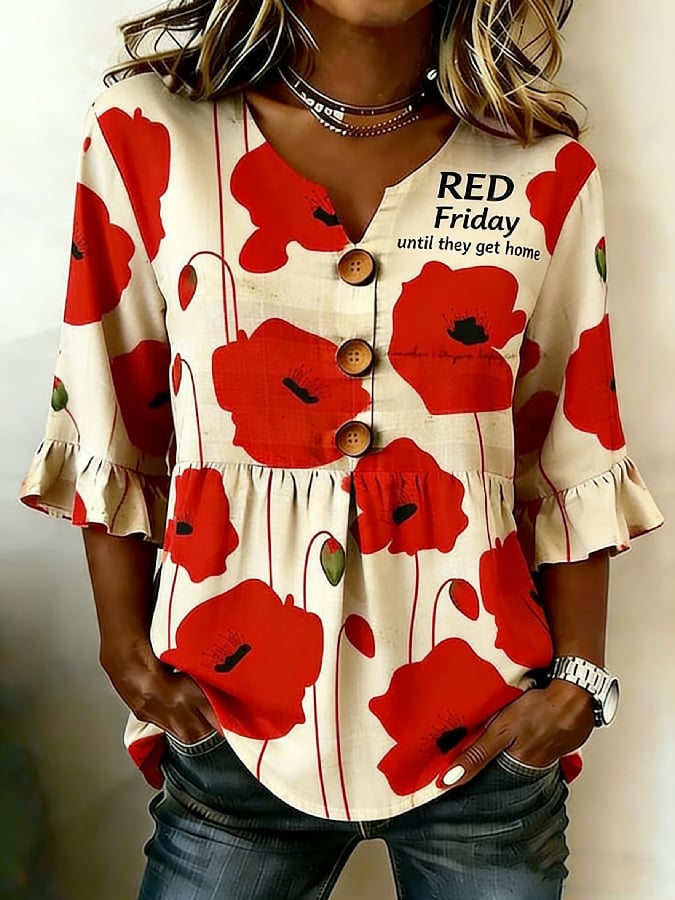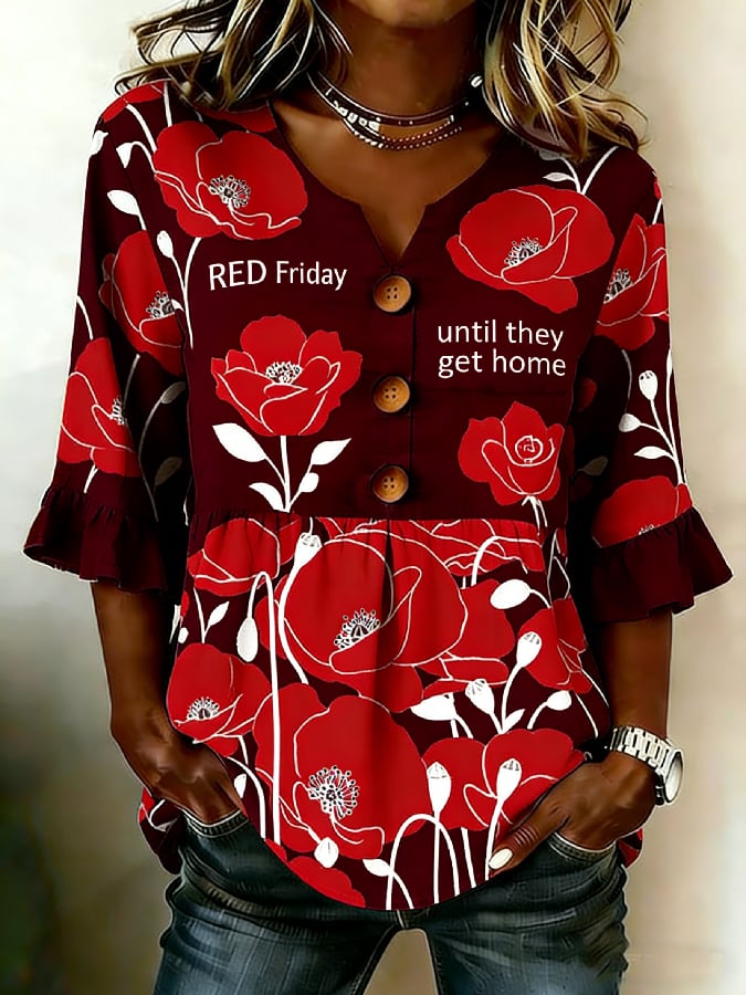 Women's Casual Red Friday Print Button-Up Shirt