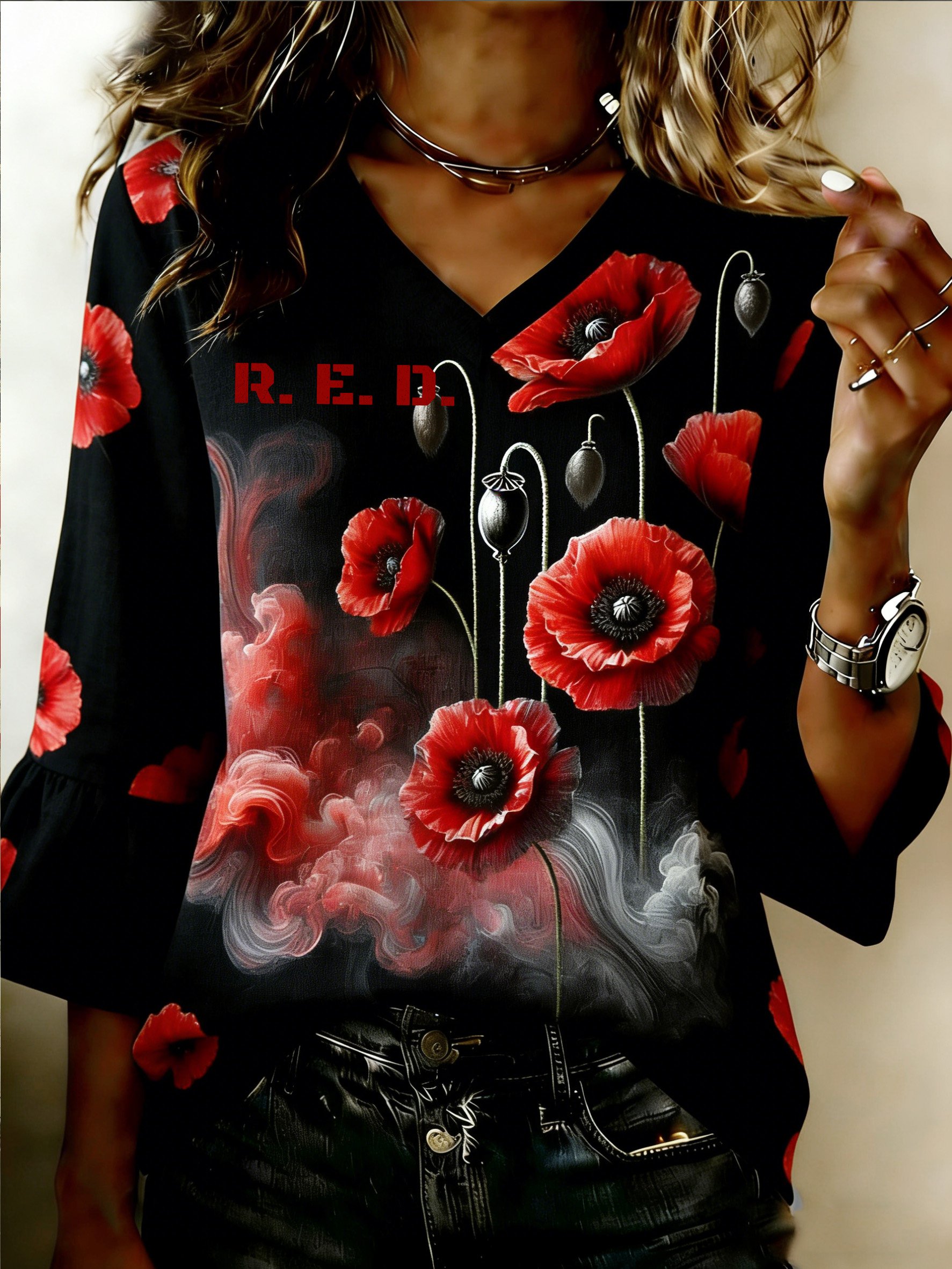 Women's Red Friday Print Casual Crew Neck Top