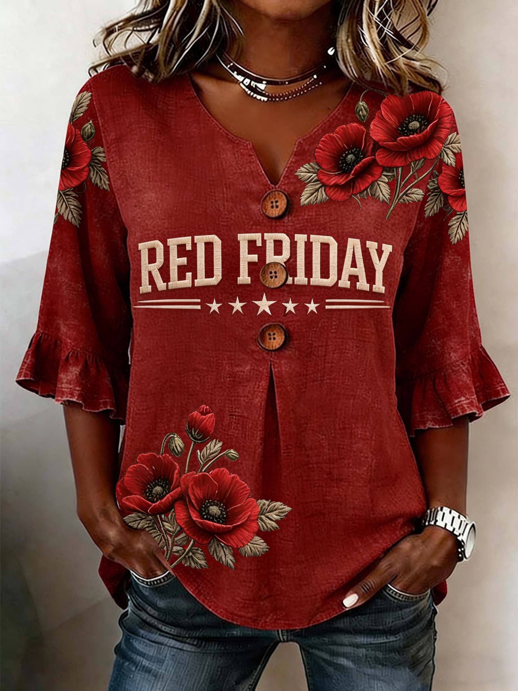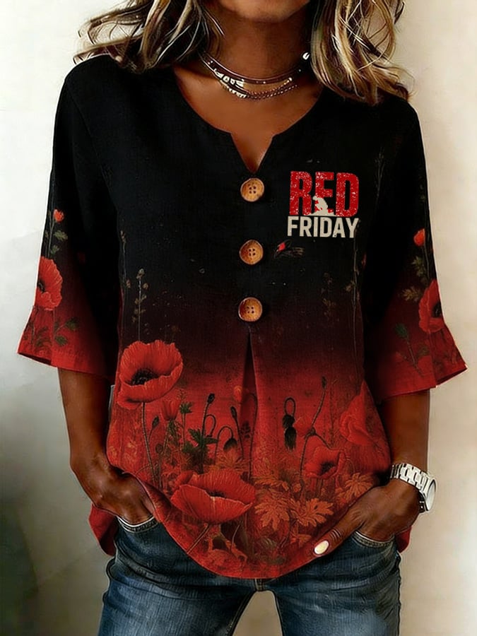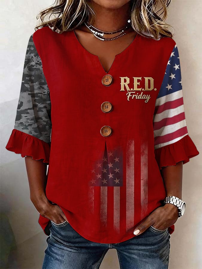 Women's Casual Red Friday Print Button-Up Shirt