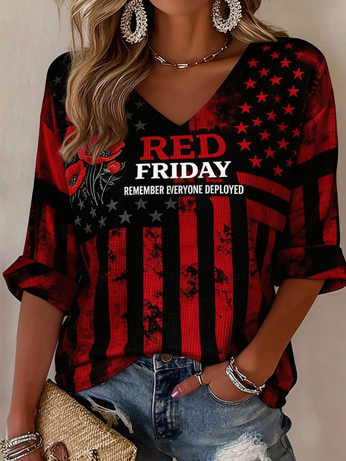 Women'S Red Friday Printed V-Neck Short-Sleeved T-Shirt