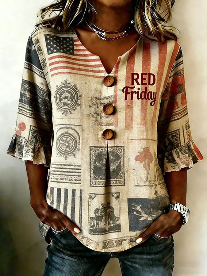 Women's Casual Red Friday Print V-Neck Mid-Sleeve Loose Shirt