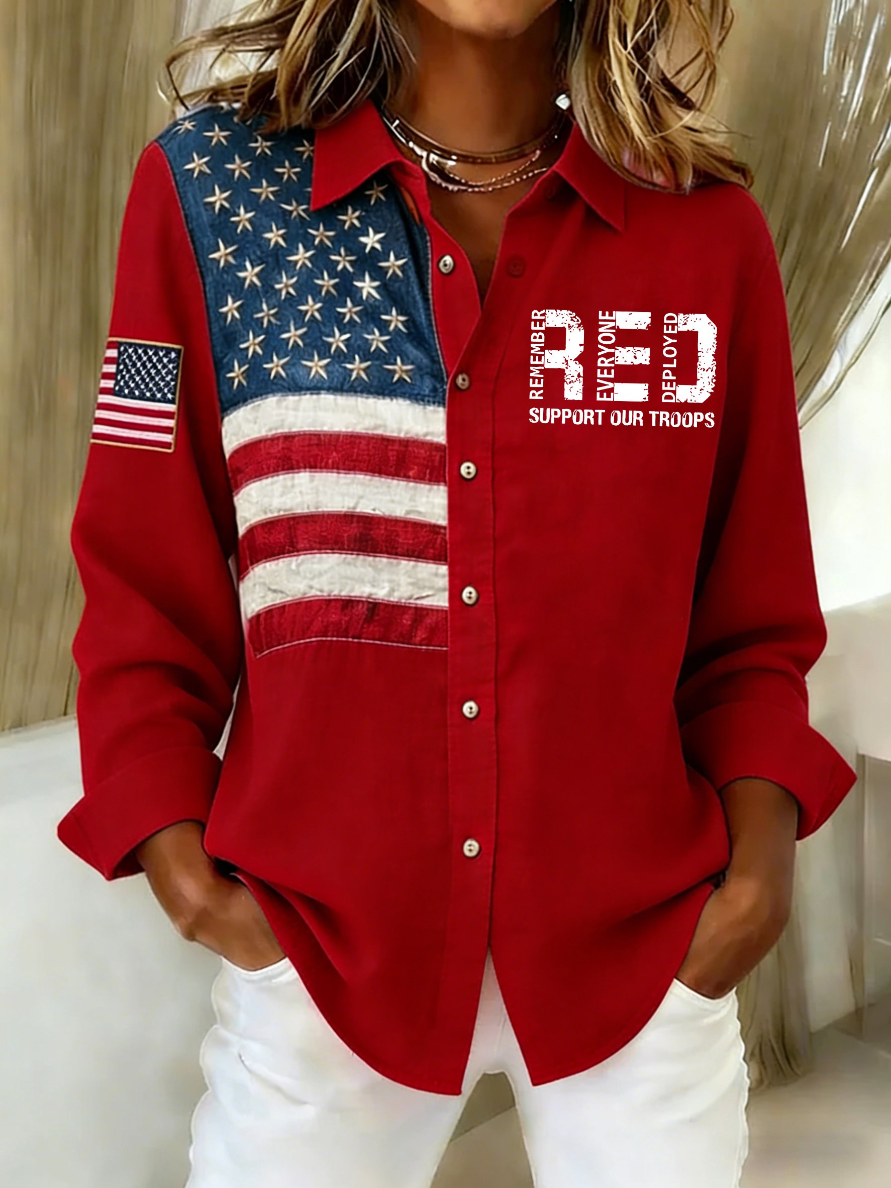 Women's Casual Red Friday Print Button-Up Shirt