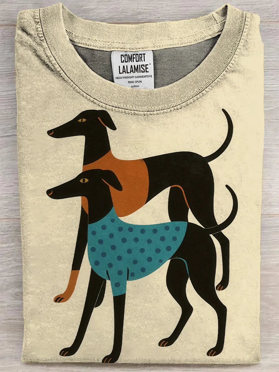 Retro Multicolor Dog Fun Art Print Casual Pure Cotton Short Sleeved T-shirt