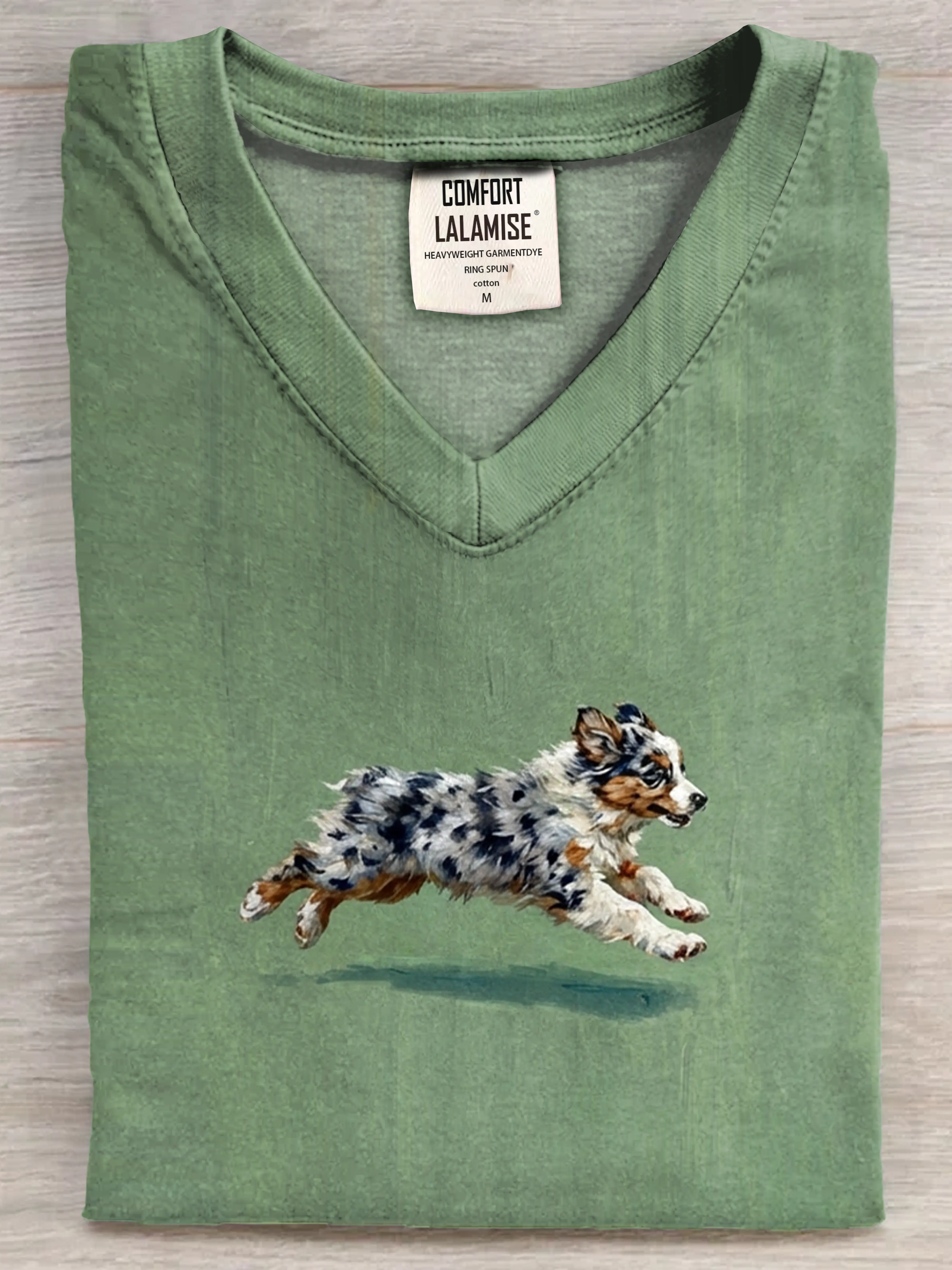 Funny Retro Cute Running Dog Art Print V-neck Casual T-shirt