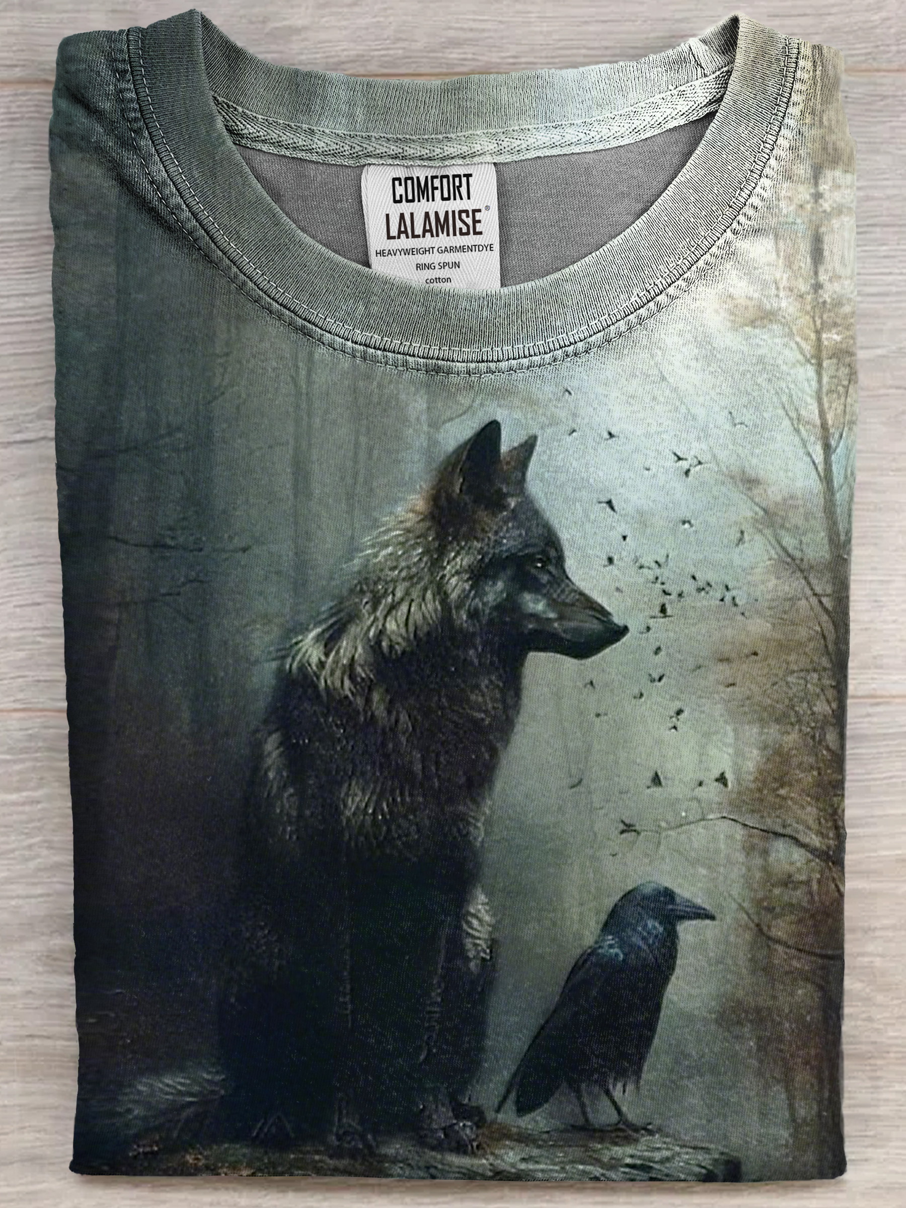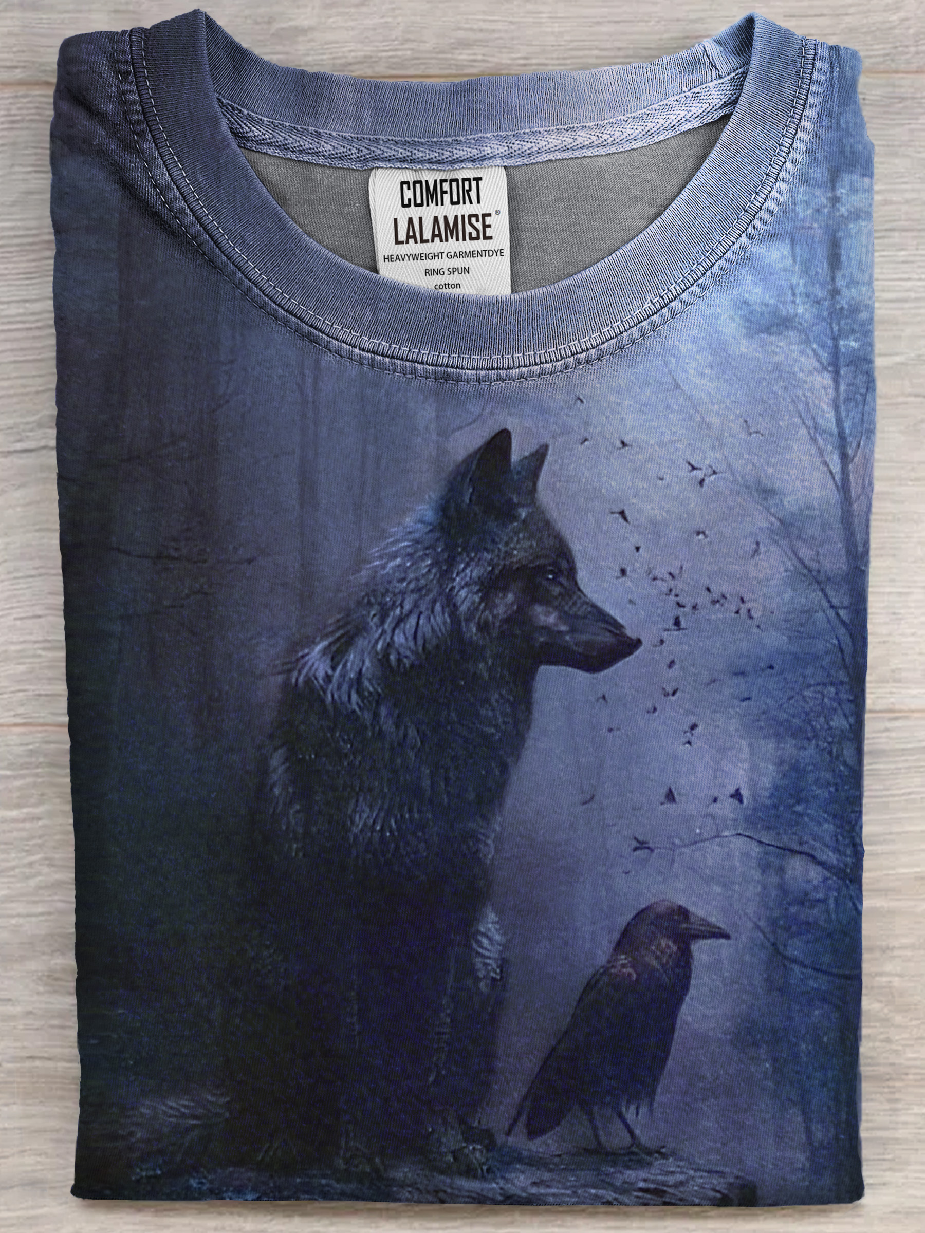 Funny Dark Wolf And Crow Art Print Casual Cotton Short Sleeve T-shirt