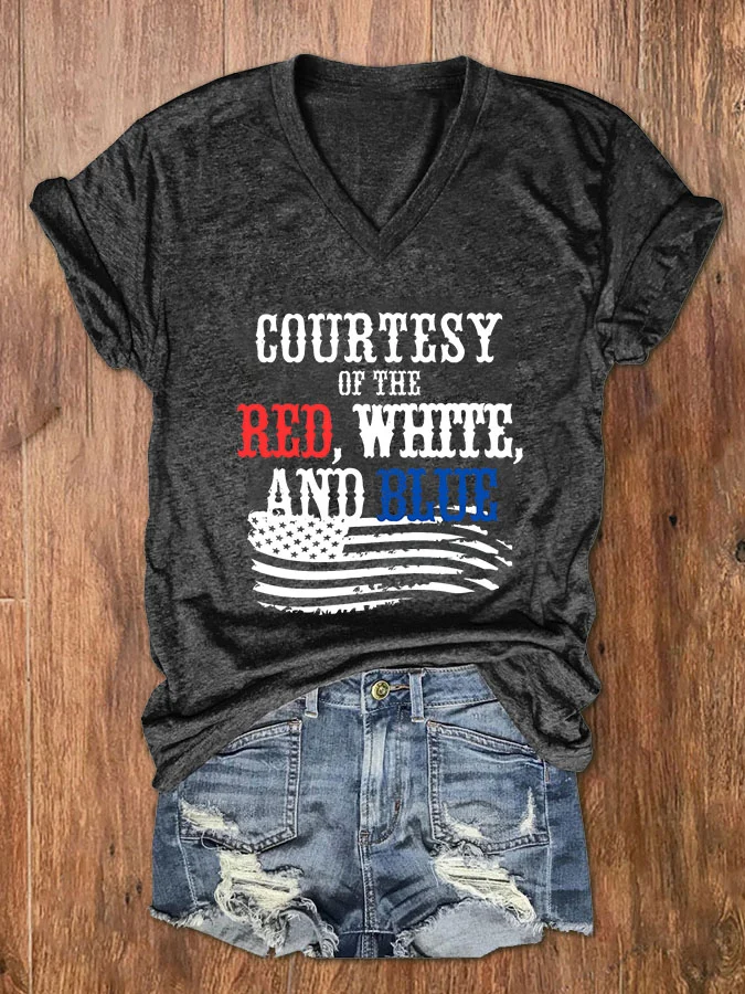 Women's Courtesy Of The Red White And Blue V Neck Casual Flag Cotton-Blend T-Shirt