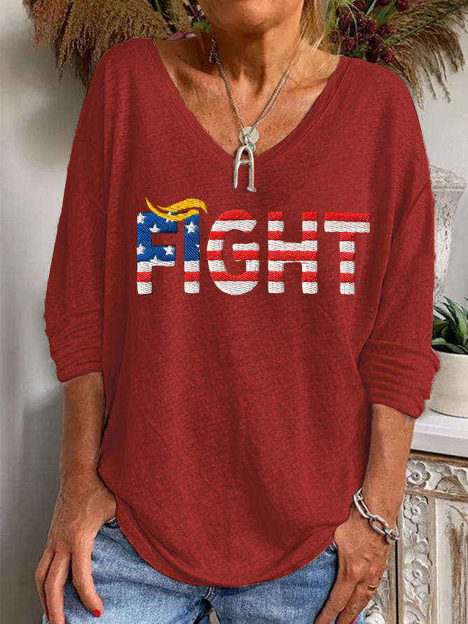 Ladies Casual Red American Flag Battle Print V-Neck Long Sleeve T-Shirt