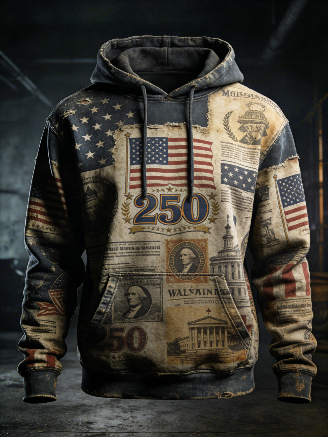 Men's Vintage USA Anniversary American Flag Art Print Pocket Hoodie