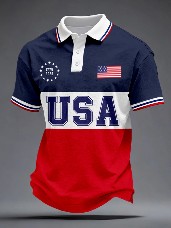 Men's USA American Flag Colorblock Print Polo Shirt