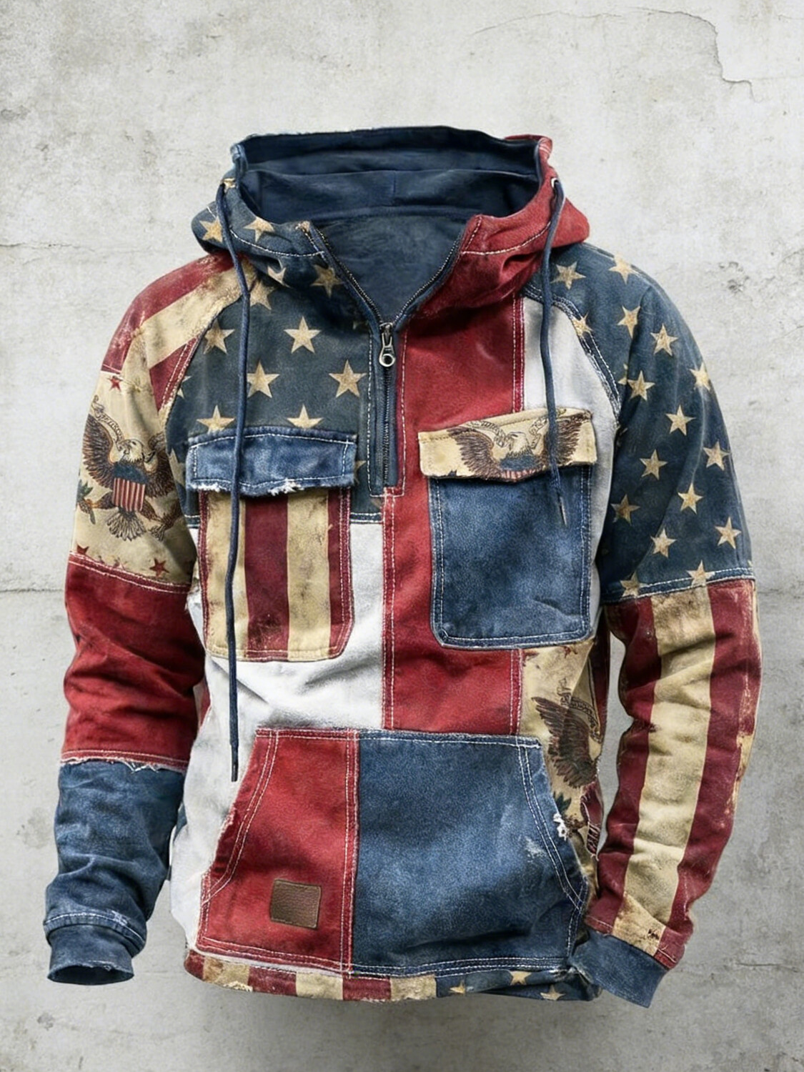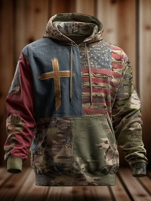 Men's Vintage Patchwork American Flag Cross Art Print Pocket Hoodie