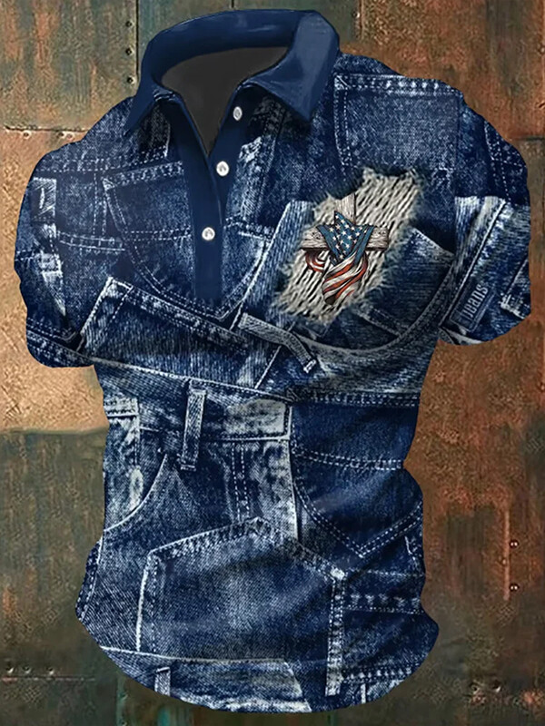 Men's Patchwork American Flag Cross Print Polo Shirt