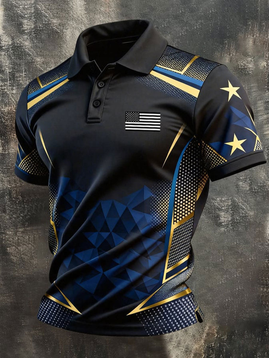 Men's American Flag and Geometric Printed Short Sleeve Polo Shirt