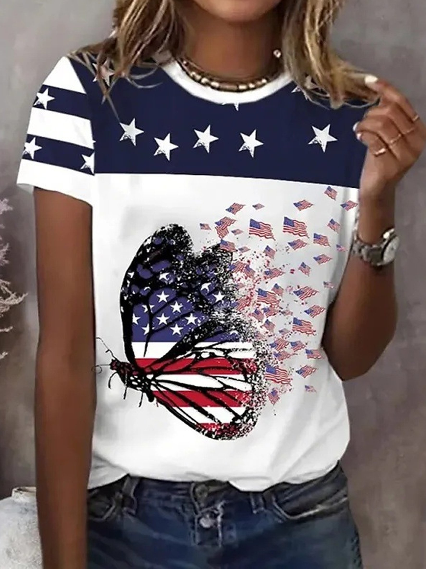 3D Printing America Flag Butterfly Crew Neck Short Sleeve T-Shirt