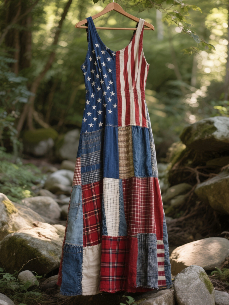 Women's USA Inspired Floral Embroidery Pattern Linen Blend Dress