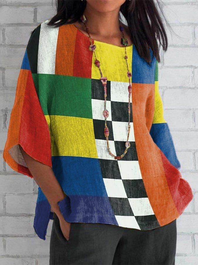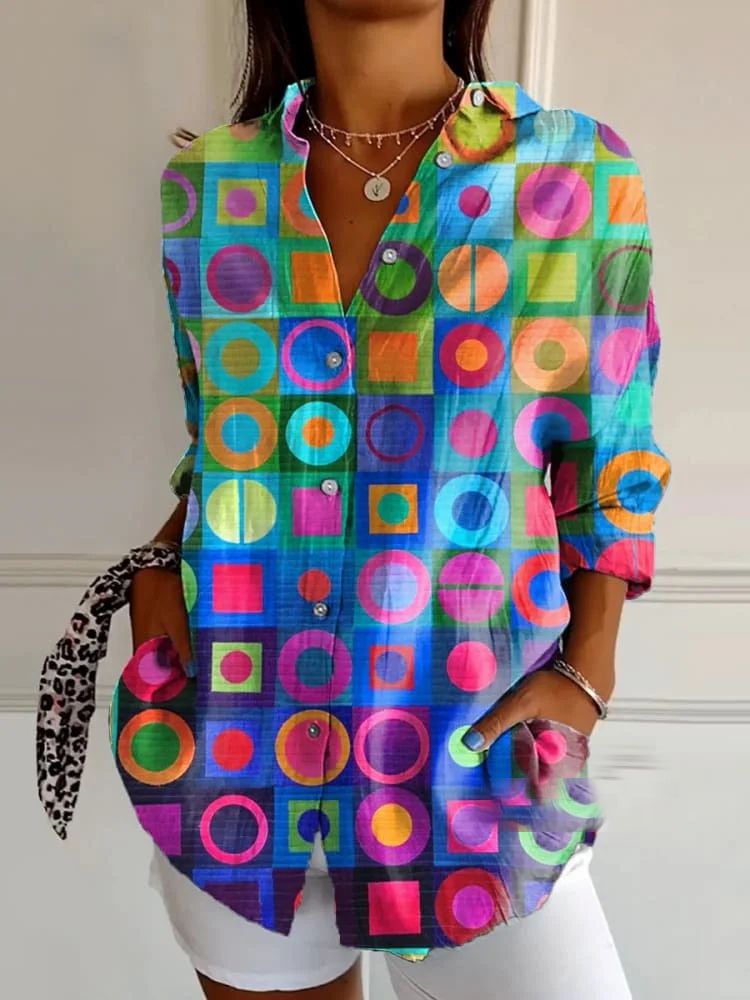 Women's casual retro rainbow gradient color oil geometric print cotton and linen shirt
