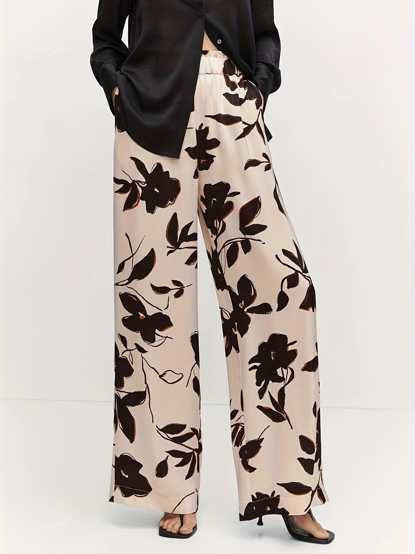 Boho Plants Print Pants, Casual High Waist Elastic Wide Leg Summer Beach Palazzo Pants, Women's Clothing