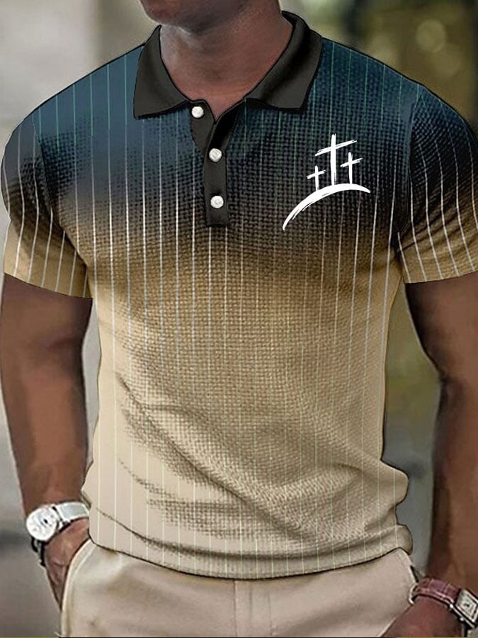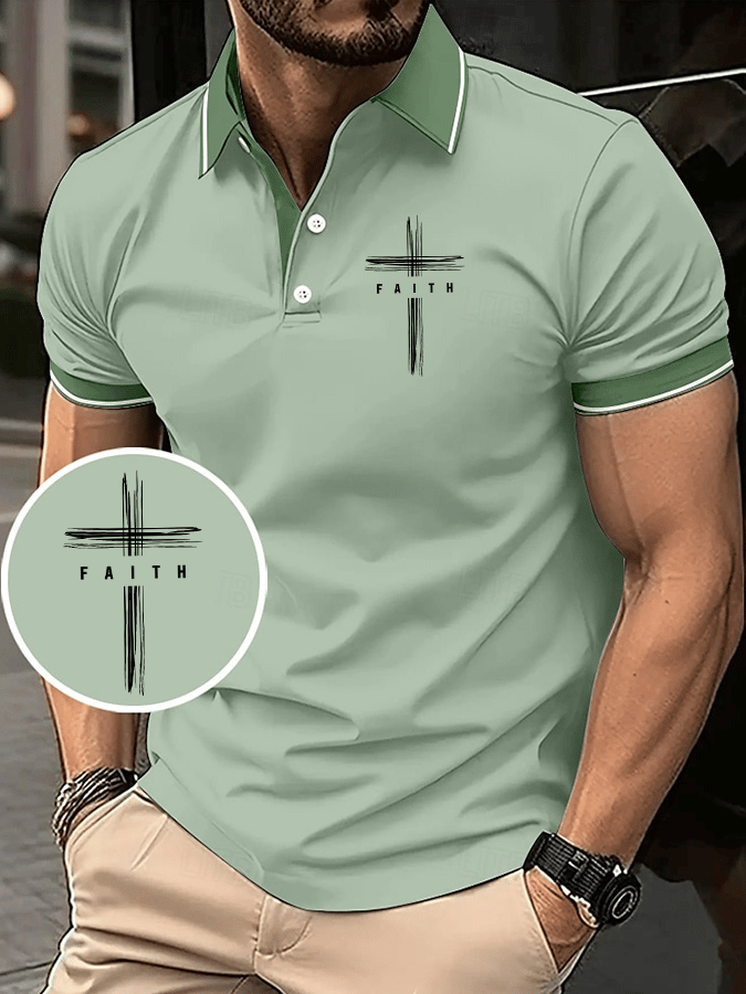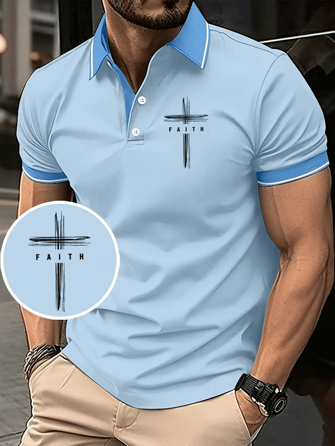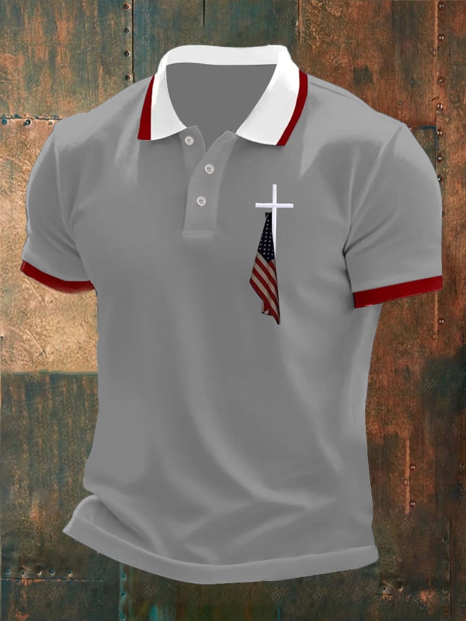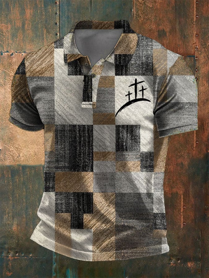 Men's retro faith cross patchwork print short-sleeved polo shirt