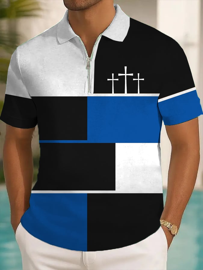 Men's Retro Faith Cross Design Printed Casual Zipper Polo Shirt