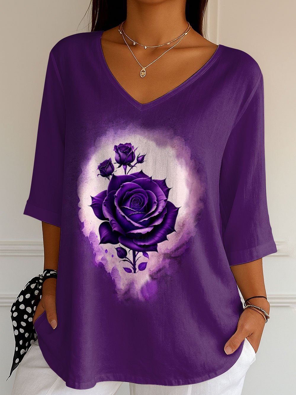 Women's Purple Floral Print Casual Long Sleeve V-Neck Shirt