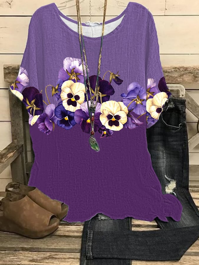 Women's Purple Floral Pansy Dementia Alzheimer's Disease Awareness Cotton and Linen Shirt