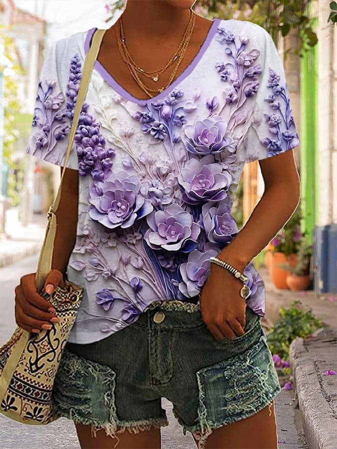 Women's Alzheimer's Purple Floral Print V-Neck T-Shirt
