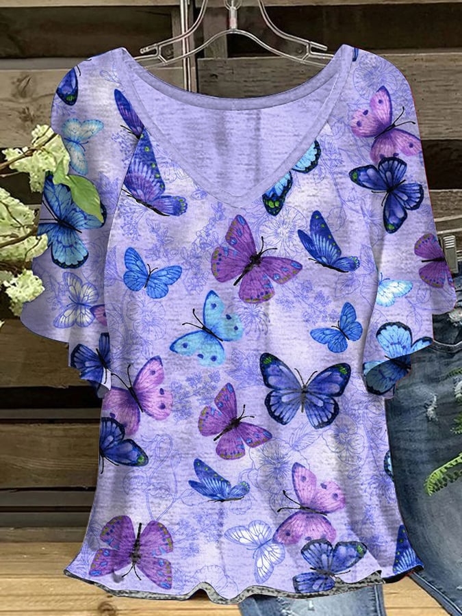 Women's Purple Floral Print Casual Long Sleeve V-Neck Shirt