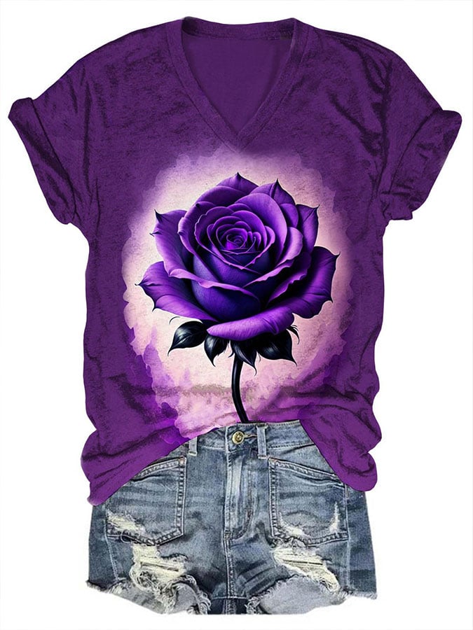 Women's Alzheimer's Awareness Purple Rose Print V-Neck T-Shirt