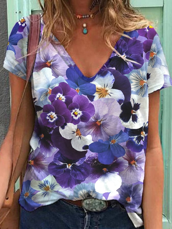 Women's Alzheimer's Purple Floral Print V-Neck T-Shirt