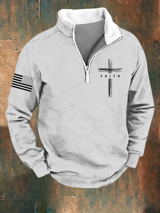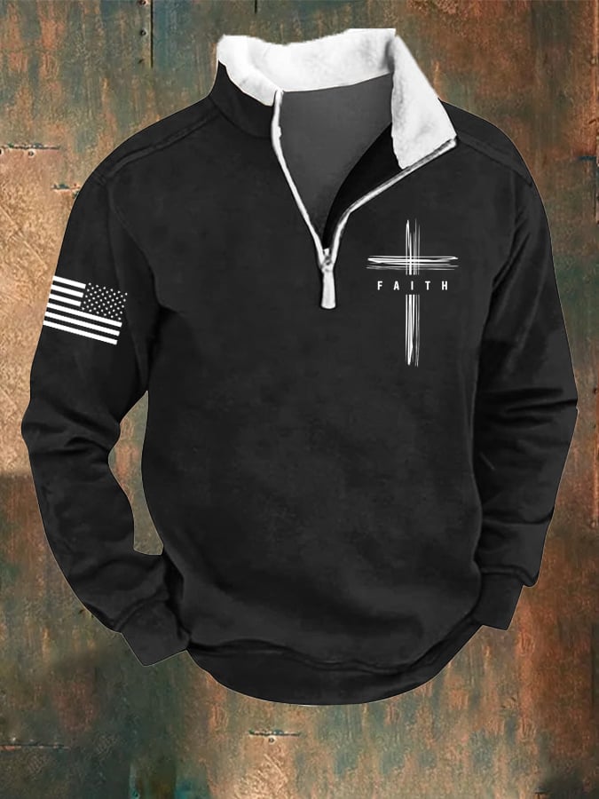 Men's Vintage Flag Faith Zipper Fur Collar Sweatshirt