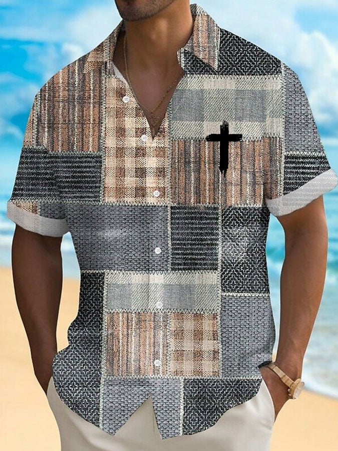 Men's Cross Printed Patchwork Pocket Design Casual Shirt