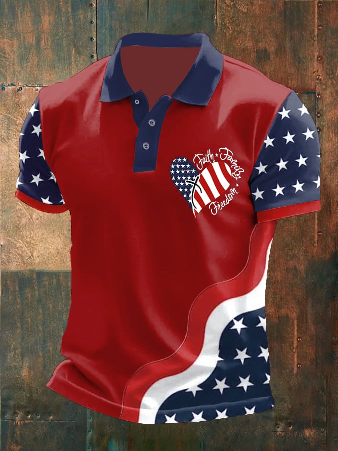 Men's Independence Day Love Faith Family Freedom Print Lapel Button Down Polo Shirt