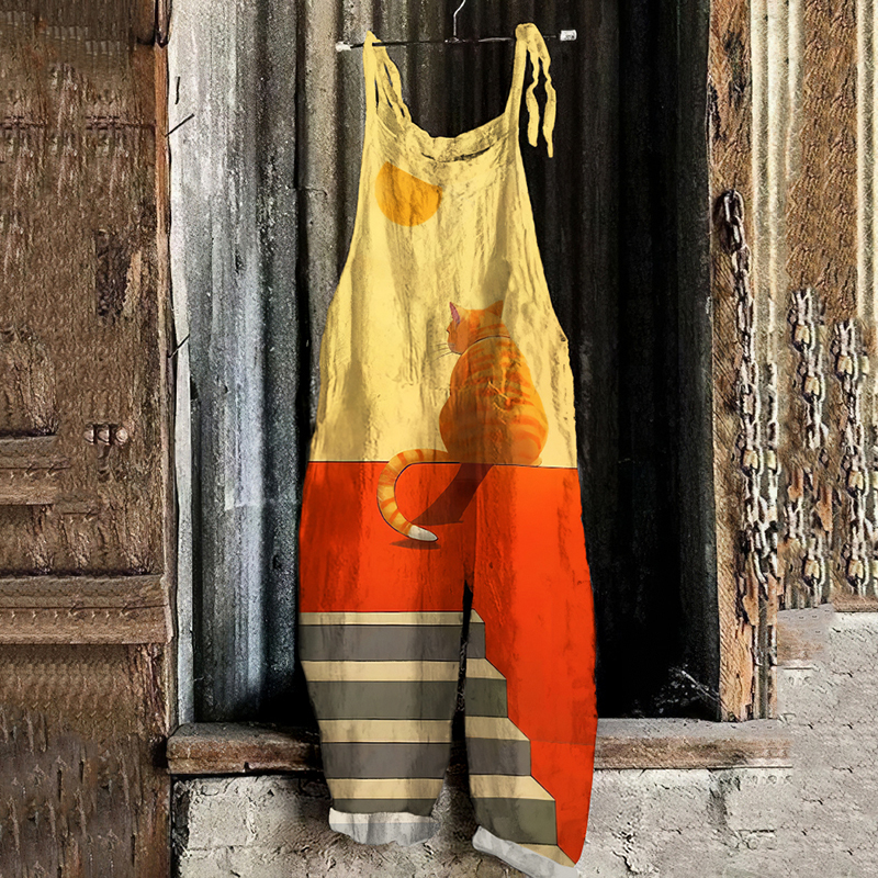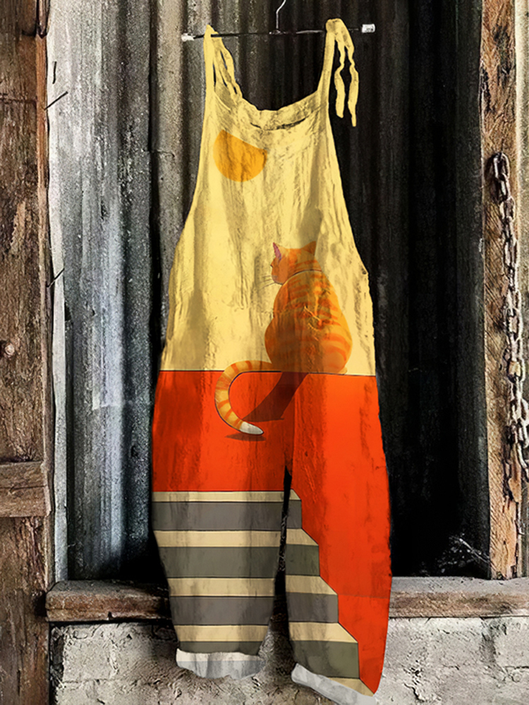 Abstract Creative Cute Cat In A Daze On The Balcony Painting Art Print Loose Casual Jumpsuit