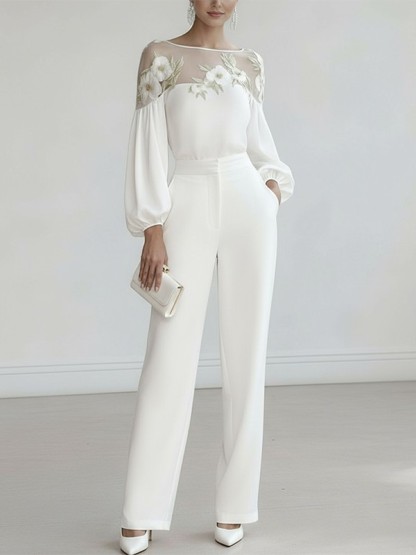 Applique Flower Shape Mesh Split-Joint Loose Puff Sleeves Round-neck Blouses&shirts Tops