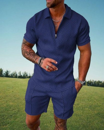 Blue Printed Men's Casual Short-sleeved Polo Set