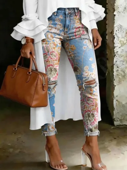 Blue Retro Floral Artistic Print Casual Ripped Skinny Jeans