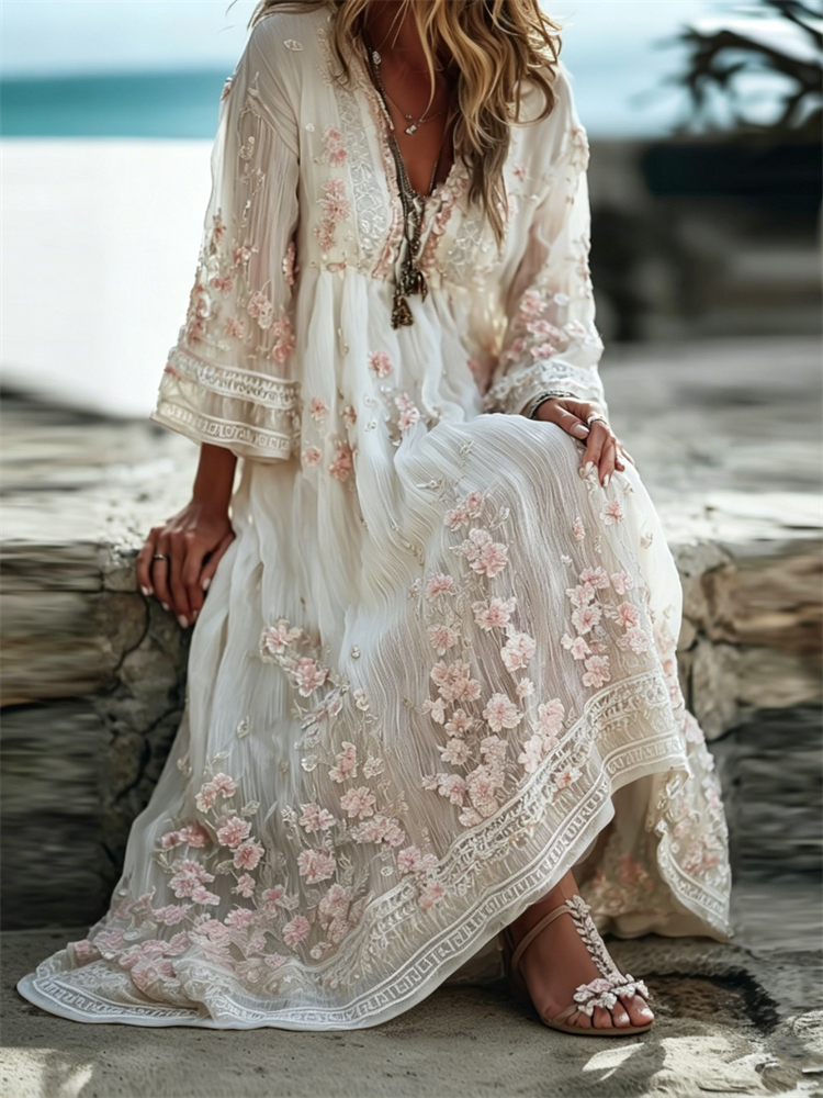 Boho Cherry Blossom Floral Flowy Linen Maxi Dress