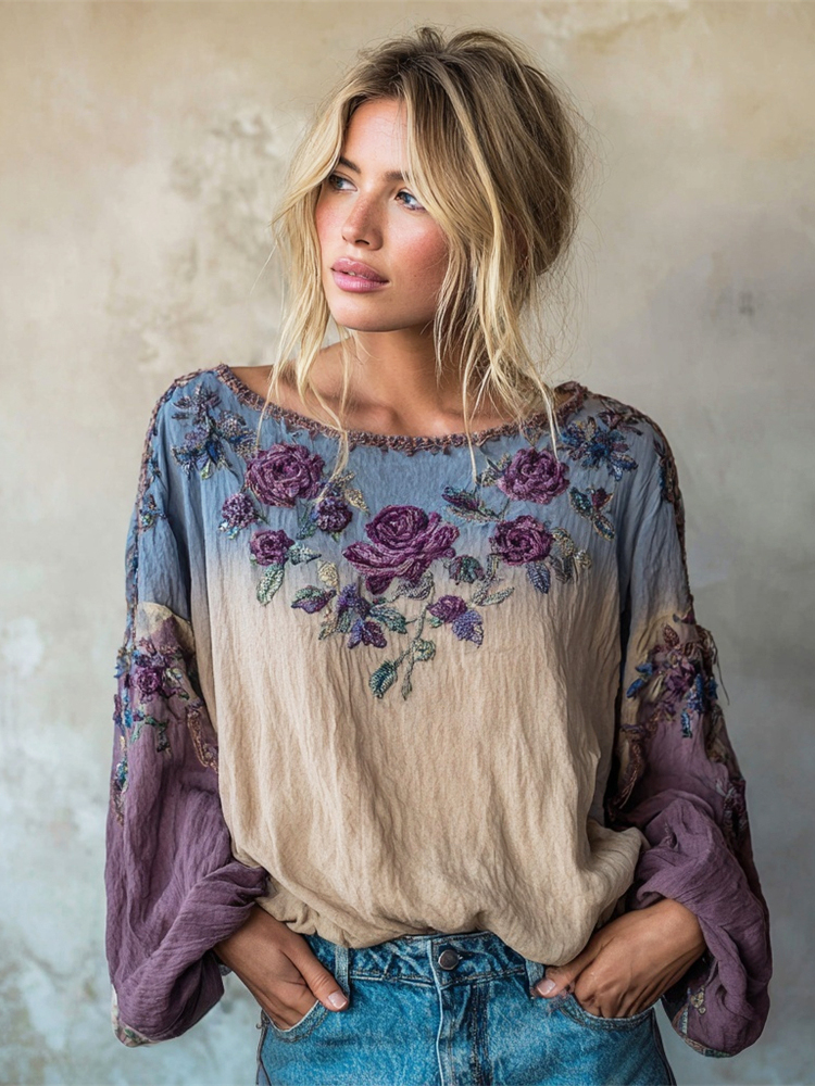 Boho Romantic Floral Embroidery Gradient Women's Linen Loose Shirt – lolonb