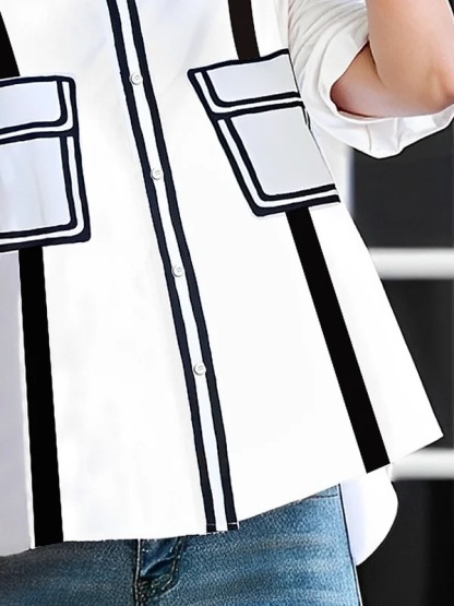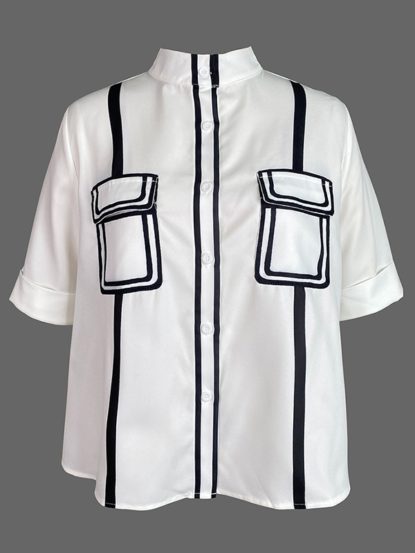 Buttoned Contrast Color Pockets A-line Half Sleeves Mock Neck Blouses&shirts Tops