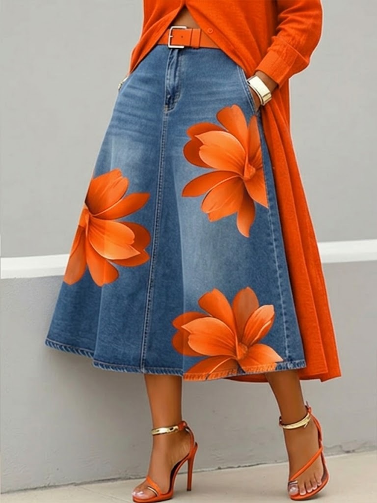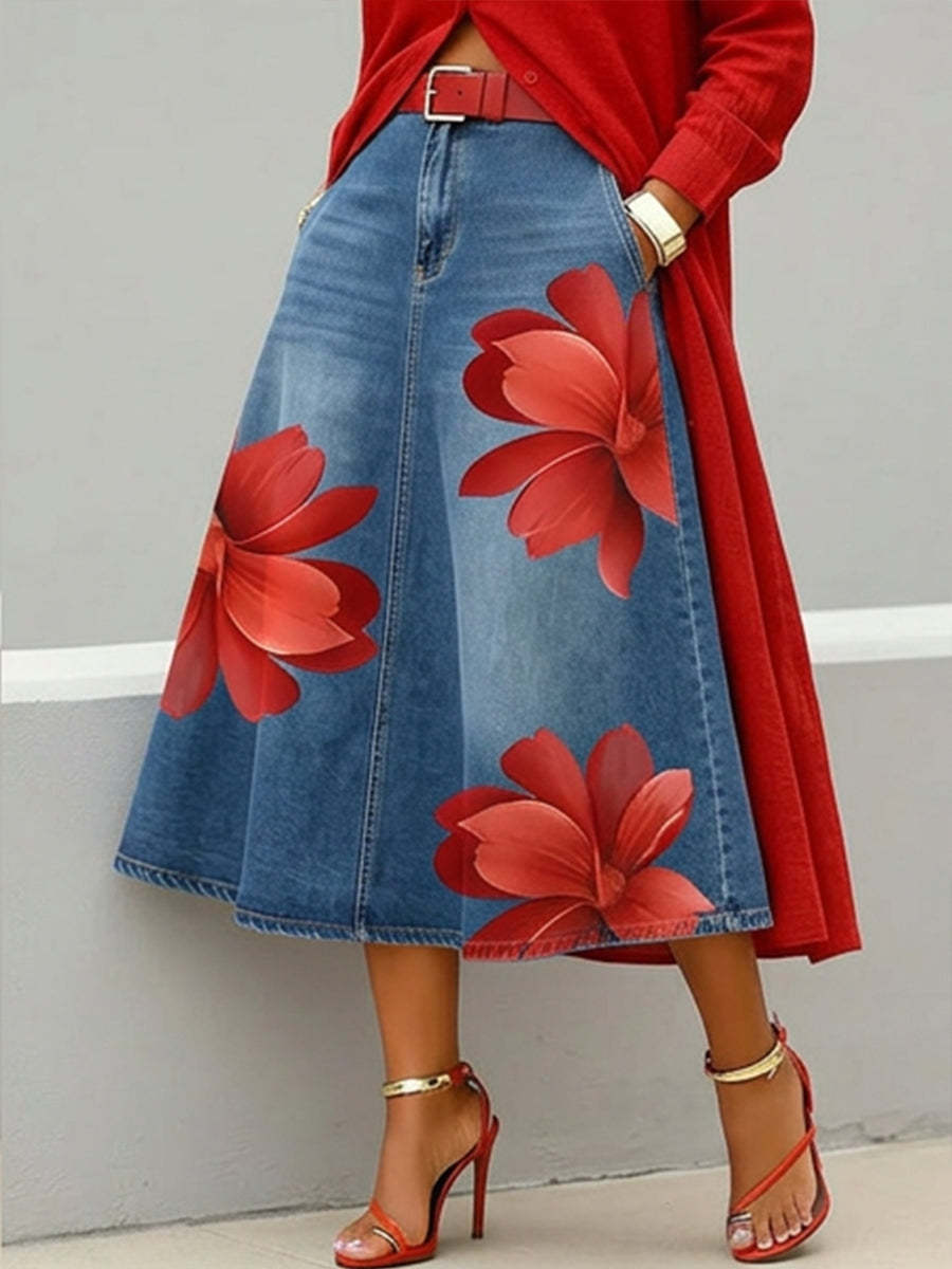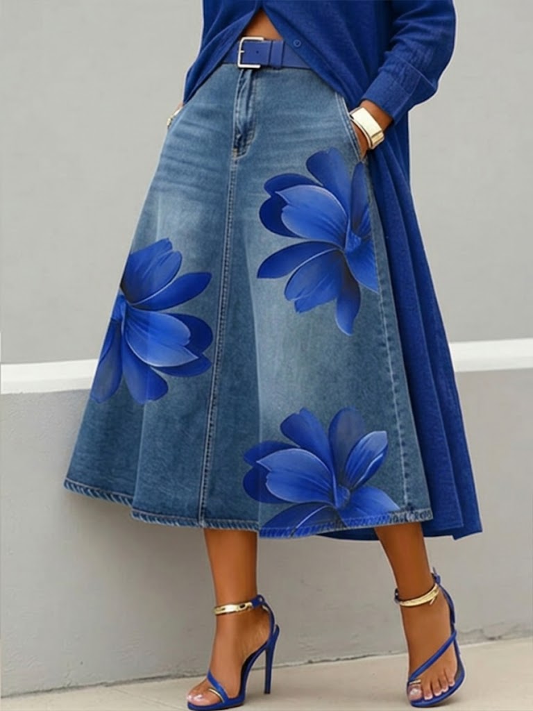 Casual Artistic Floral-print A-line Denim Skirt