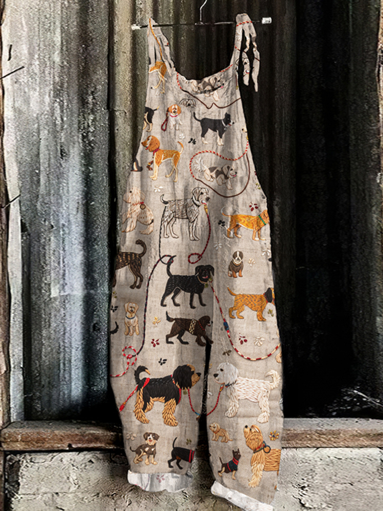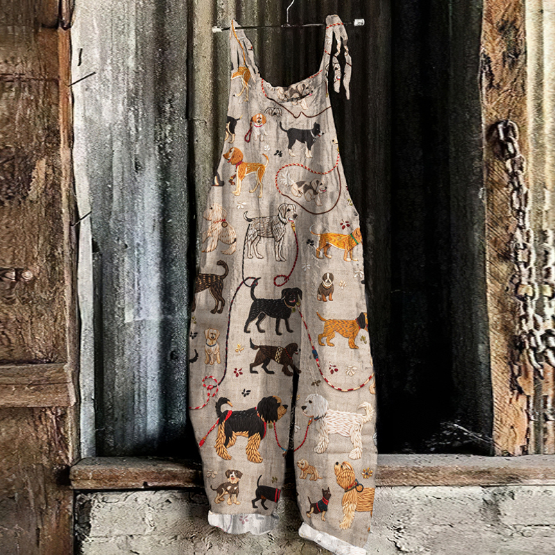 Casual Embroidered Walking The Dog Art Print Loose Jumpsuit