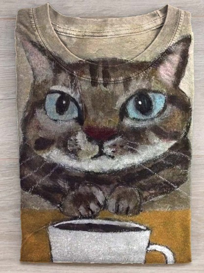 Cat and Coffee Art Print Casual Short Sleeve T-shirt