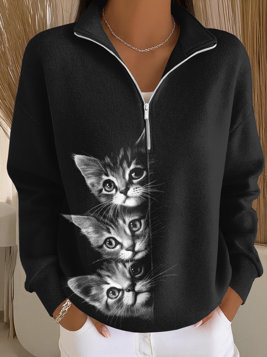 Cat Art Print Casual Zip-Up Sweatshirt