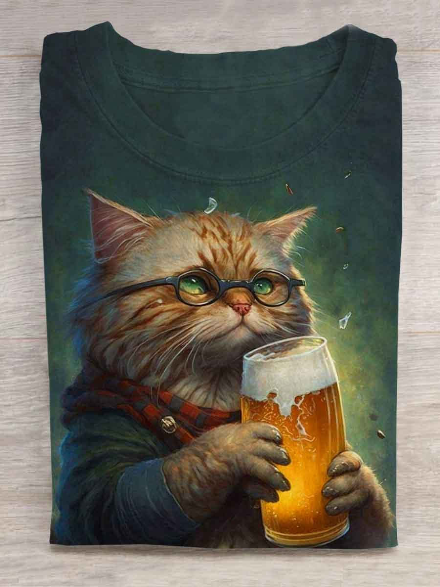 Cat Drink Beer Funny Print T-shirt