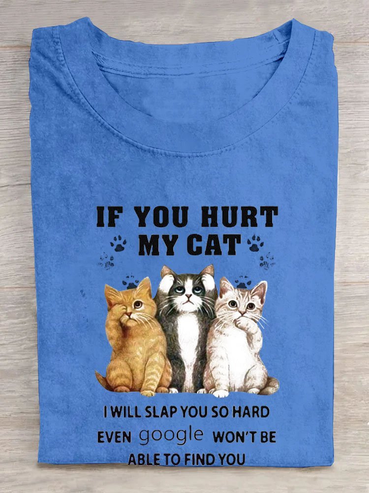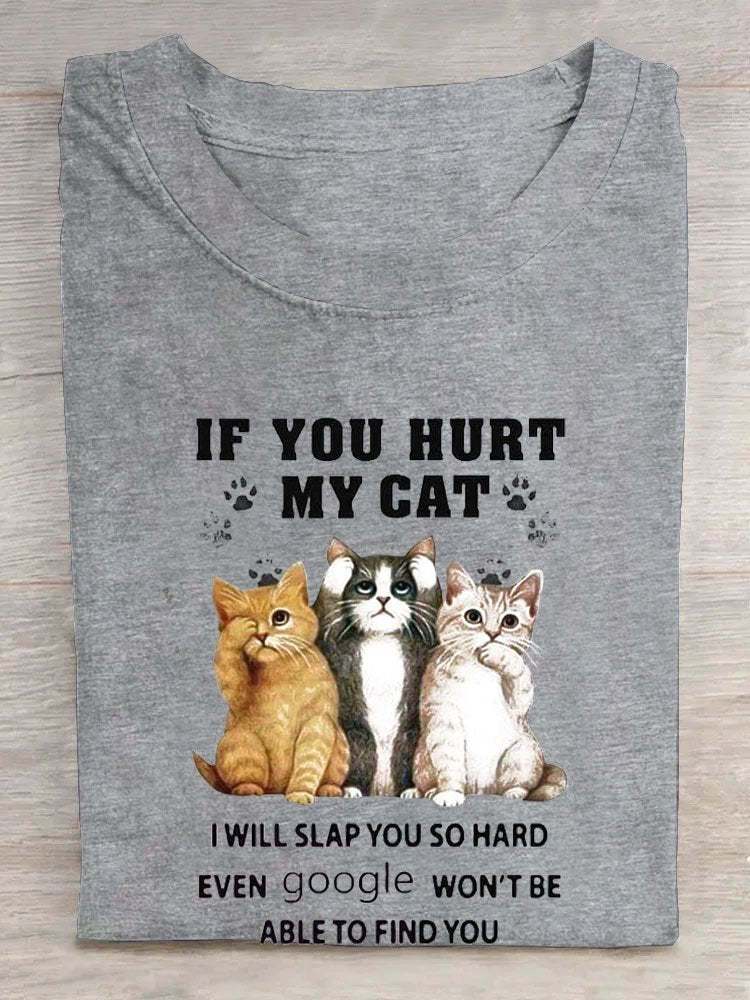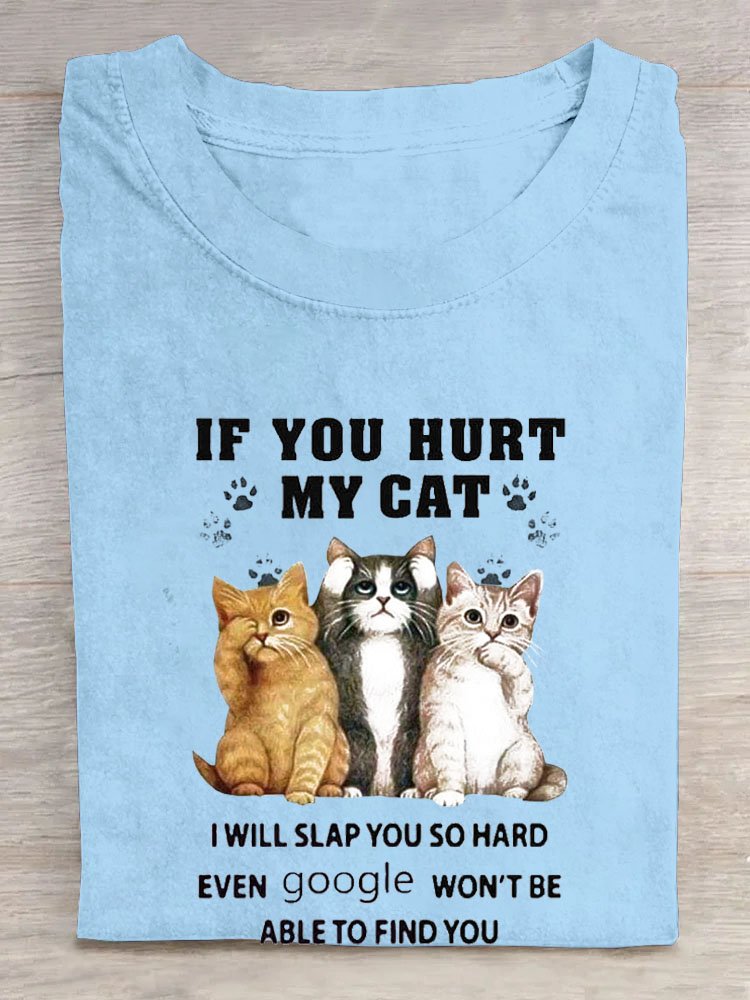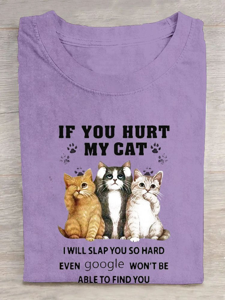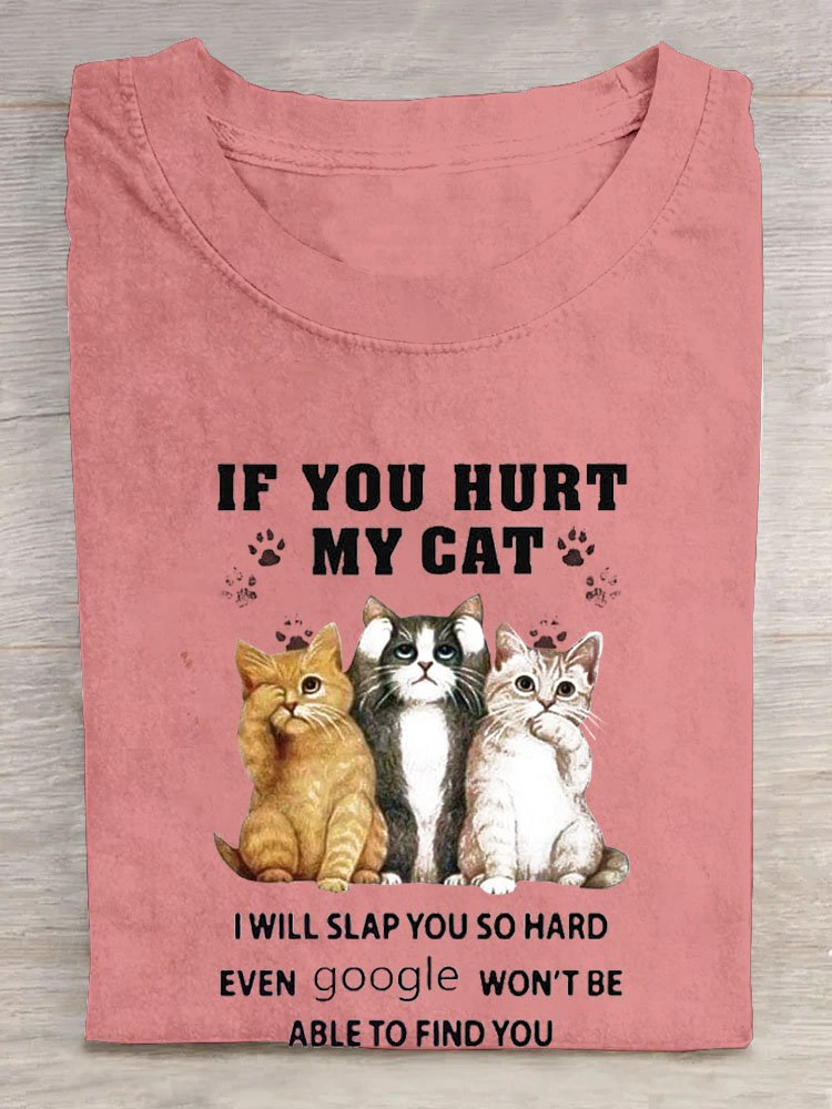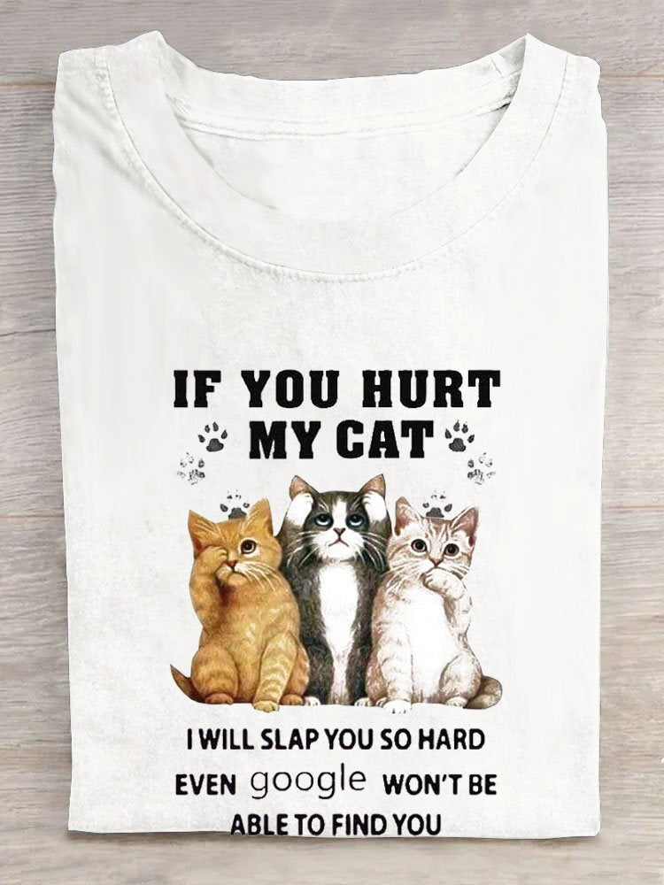 Cat & Text Letters Printed Crew Neck T-Shirt