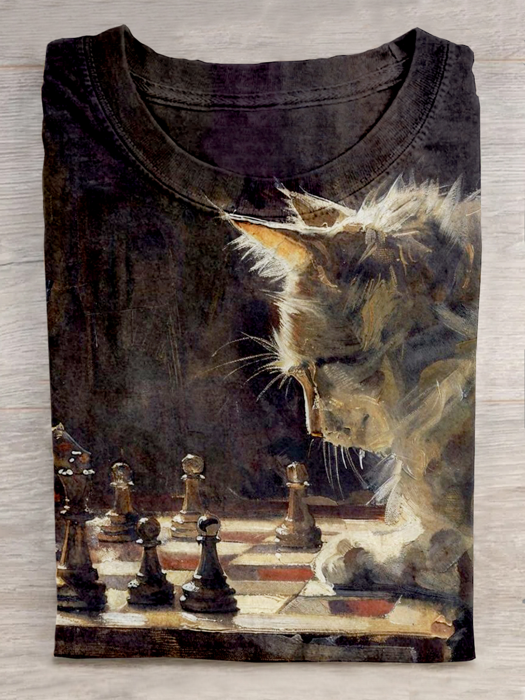 Chess Cat Art Print Casual Short Sleeve T-shirt