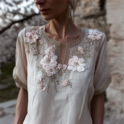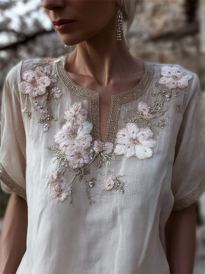 Classy Cherry Blossom Notch Neck Flowy Linen Tunic