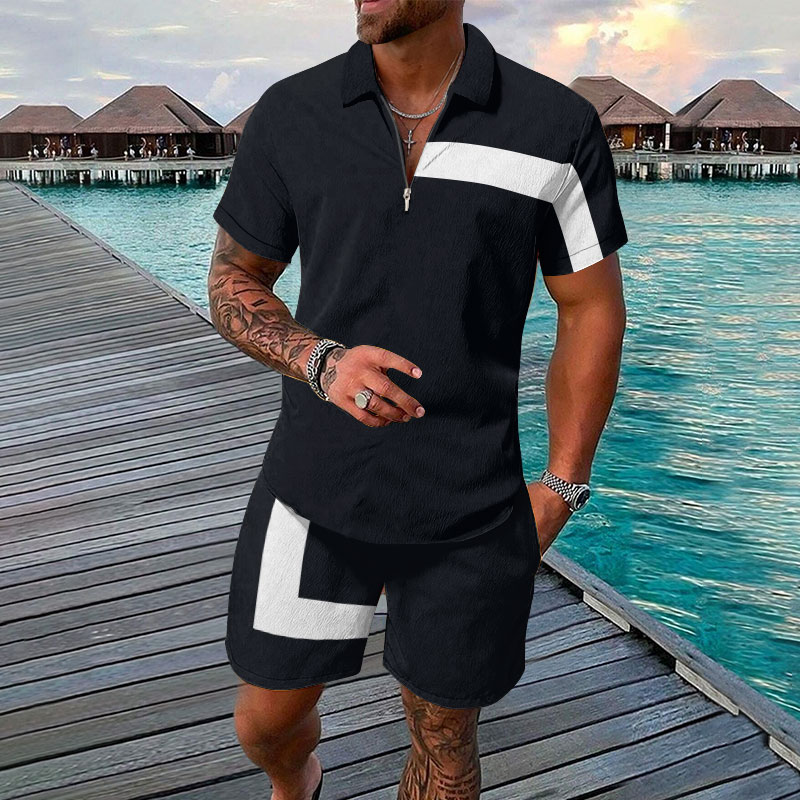 Colorblock Striped Asymmetric Print Short-sleeved Polo Set