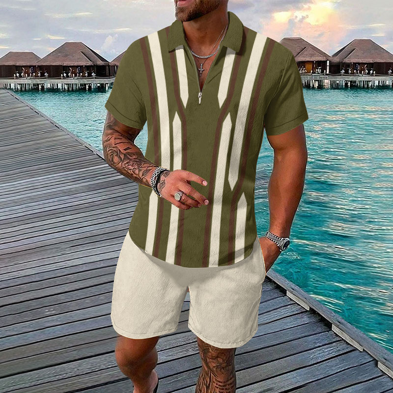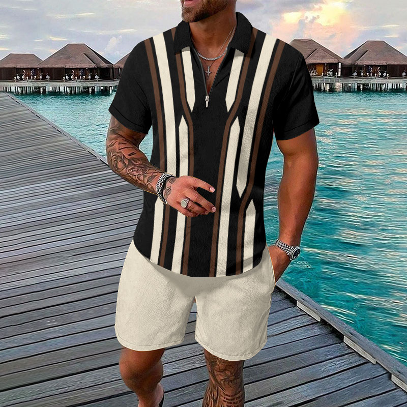 Contrast Wrap Stripe Print Short Sleeve Polo Set