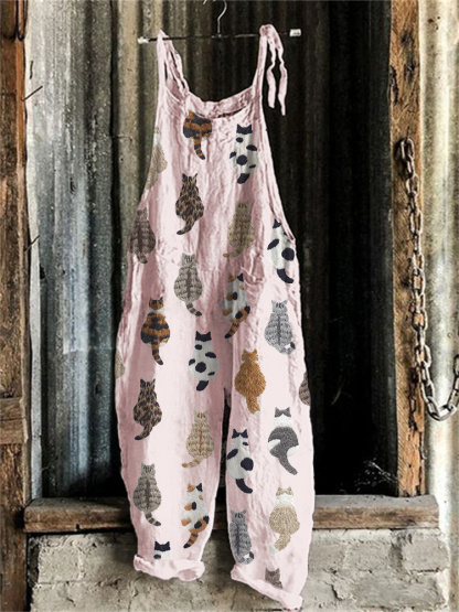 Cute Cats Embroidery Pattern Linen Blend Casual Jumpsuit
