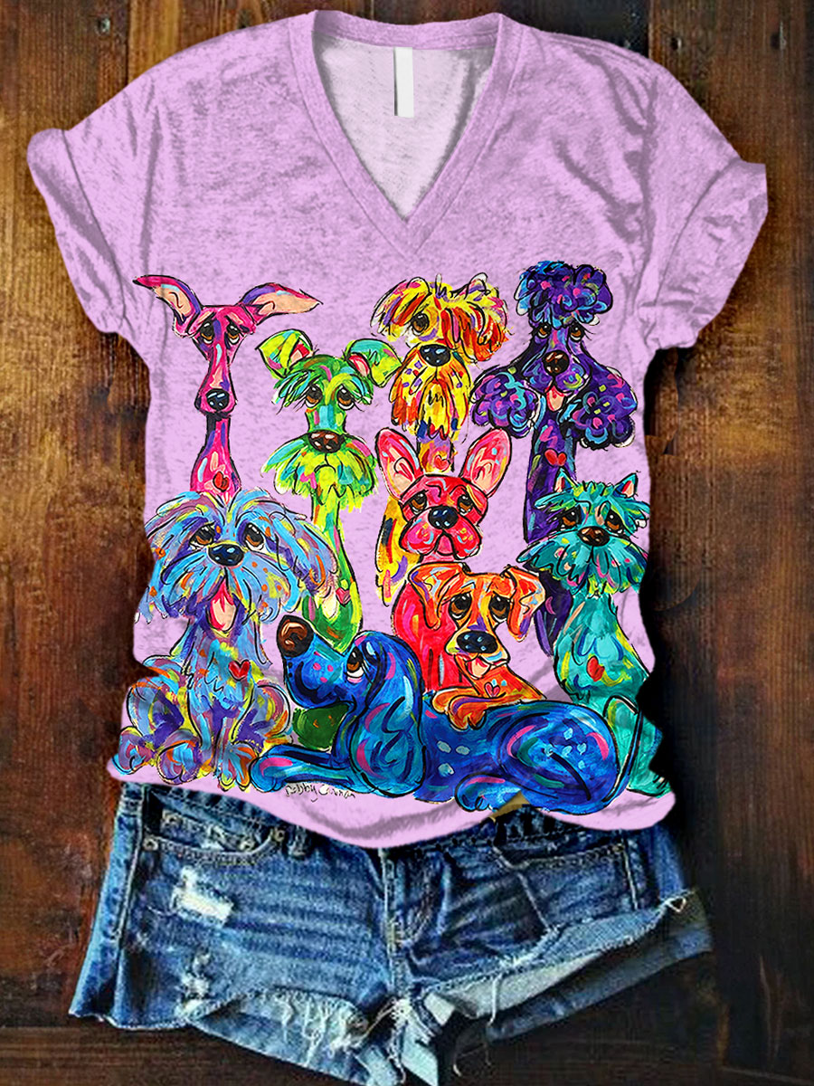 Cute Dogs Art Print V-neck Casual T-Shirt